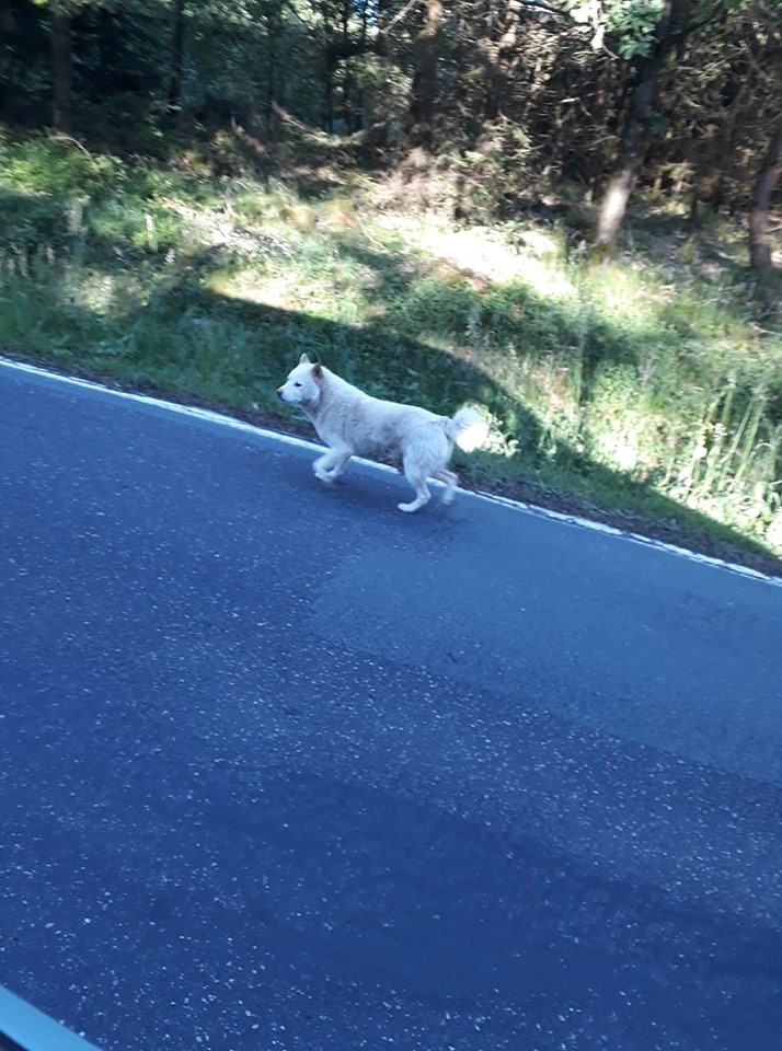 Wie immer hatte der Tag viel Arbeit, Stress und Rennerei gebracht. Jetzt, kurz vor Feierabend, musste ich noch schnell einkaufen und dann zügig nach Hause fahren. In Gedanken war ich schon bei der Zubereitung des Abendessens, als mir ein weißer Hund fast ins Auto lief. Ich konnte nur schnell ein Foto aus dem Auto heraus schießen, dann verschwand der Kleine schon im Wald.